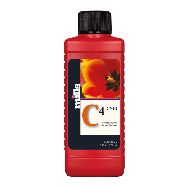 Mills C4 es un sofisticado estimulante de floración compuesto por macro y micronutrientes, bioestimuladores, carbohidratos y oligoelementos que nos garantizan una producción masiva de flores y frutos.