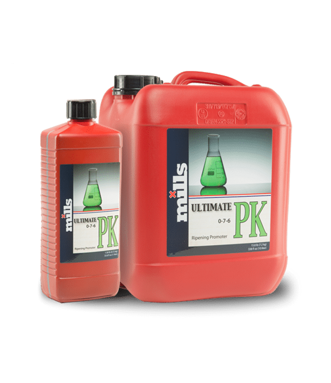Mills Ultimate PK es un potente estimulador de la floración, diseñado para ser utilizado durante las últimas 2 a 4 semanas del período de floración. Su excelente composición de proporciona a la planta todos los nutrientes que necesita durante la fase final para garantizar mayor cantidad de fruto y una estructura celular fuerte.