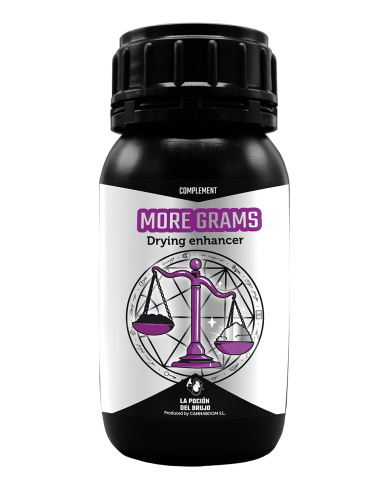 MORE GRAMS Es una fórmula única en el mundo que lanza CANNABOOM. Logra que tu cosecha pierda menos peso en el proceso de secado. MORE GRAMS actúa rellenando el interior de las flores con fibras vegetales, almidón y proteínas, transformando parte del agua que hay en el interior en masa, además notarás que, conforme van pasando los días, en el proceso de secado las flores estarán más llenas y se irán poniendo más densas.
