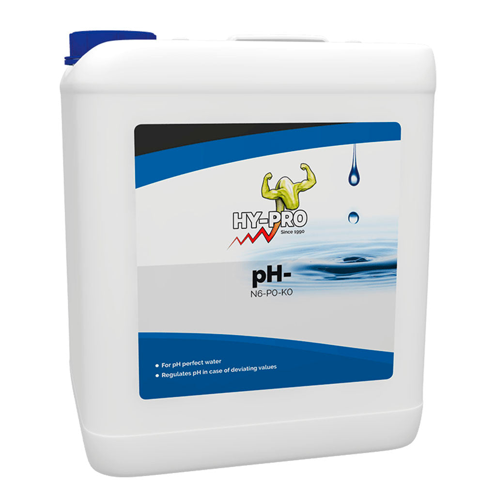 Ph- de Hy-Pro 5 litros es producto diseñado de forma específica para tal fin, regular el nivel del ph, concretamente, PH- baja el nivel del pH. Se puede usar tanto en crecimiento como en floración y de esta manera resulta más cómodo que si necesitamos dos productos como pasa con otras marcas.